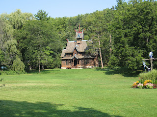 Two weeks ago, I described my quest to discover the origin of the Norwegian dragons lining some of the roofs in my new home town of Mount Horeb, WI. My quest led me to a secluded valley outside town where I found Little Norway. Immediately I knew I’d come to the right place: note the dragons along the top of the visitors’ center: